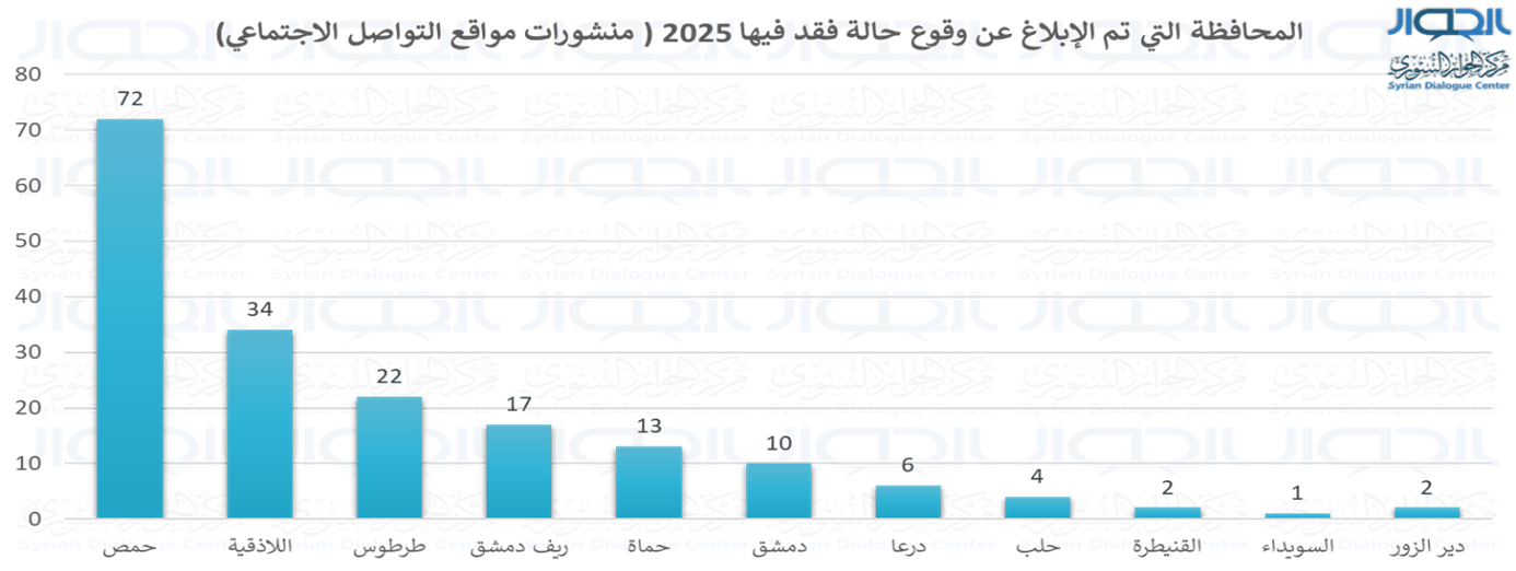 الشكل 13: المحافظة التي تم الإبلاغ عن وقوع حالة فقد فيها عام 2025 (منشورات مواقع التواصل الاجتماعي).
