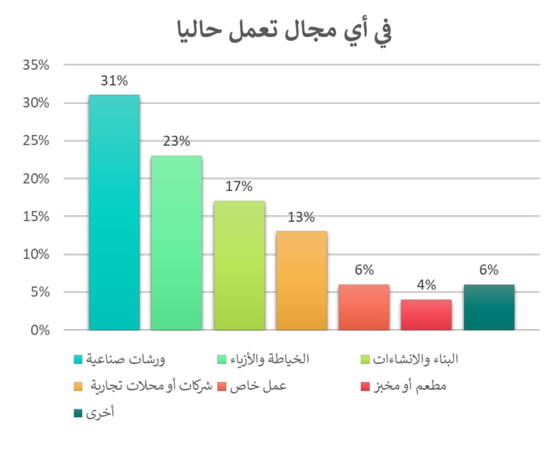 تشير نتائج الاستبانة إلى أن الشريحة الأكبر من العمالة السورية ضمن الشريحة المدروسة تعمل في قطاع الورشات الصناعية التي تضم ورشات النجارة والحدادة والتصنيع.. إلخ، بنسبة وصلت إلى 31% من إجمالي الشريحة المستطلعة آراؤها، بينما احتل قطاع الألبسة والأحذية الذي يشمل ورشات الخياطة والتطريز والأحذية القطاع الثاني الأكثر استقطاباً للعمالة السورية بنسبة تصل إلى 23 %، ثم يأتي قطاع الإنشاءات في المرتبة الثالثة، ويشمل كل ما يتعلق بإنشاء وإكساء المباني والشقق بنسبة تصل إلى 17% (الشكل 1).