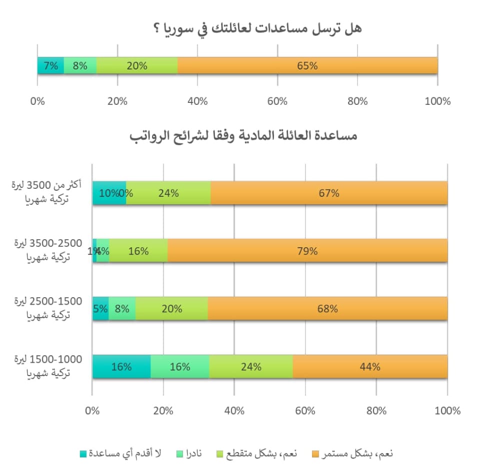 يقوم أغلب العاملين السوريين في سوق العمل التركي -ورغم تدنّي رواتبهم دون الحد الأدنى للأجور- بتحويل جزء من رواتبهم بشكل شهري لعائلاتهم داخل سوريا؛ حيث نجد أن 85% من الشريحة التي درسها البحث يقومون بتحويل جزء من رواتبهم لعائلاتهم، بينهم 65% يقومون بهذه التحويلات بشكل دائم ومكرر كل شهر.
