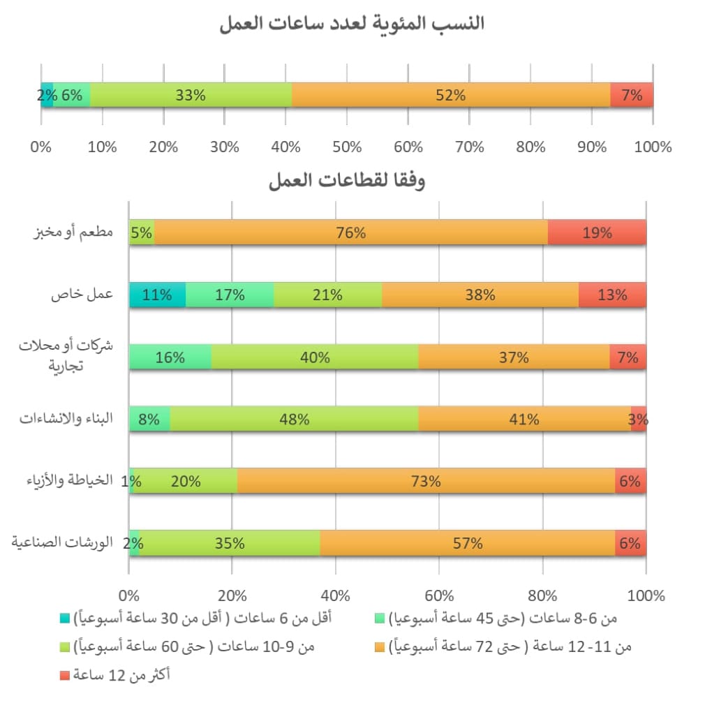تشير نتائج الاستبانة إلى أن 92% من العاملين يعملون فعلياً أكثر من 8 ساعات عمل يومياً (45 ساعة عمل أسبوعياً) دون احتساب ساعات العمل الإضافية أو الساعات التي يقضونها في المواصلات يومياً، بينهم52% يعملون 11- 12 ساعة (65- 72 ساعة أسبوعياً)، و7% يعملون أكثر من 12 ساعة يومياً، أي أكثر من72 ساعة أسبوعياً (الشكل 2).