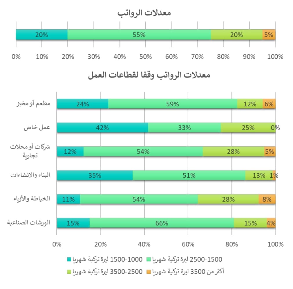 بينما أشار المسح الذي أجراه الهلال الأحمر التركي أن متوسط الرواتب تراوح بين 1000-1300 ليرة تركية؛ فقد كان قطاع صناعة النسيح الأعلى أجراً نسبياً، يليه قطاع التصنيع ثم التجارة. وقد أظهر المسح وجود اختلافات كبيرة في الرواتب بين المحافظات؛ حيث كانت الرواتب في المحافظات الغربية أعلى بنحو 50 % من بقية المحافظات، وهذا يعود للتفاوت الكبير في تكاليف المعيشة، إضافة إلى أن نمط العمل فيها يكون بدوام كامل، على عكس بعض الأعمال في المحافظات الجنوبية التي قد يغلب عليها أن تكون أعمالاً موسمية أو غير منتظمة، وهو ما يفسّر انتقال العديد من العائلات السورية بين المحافظات؛ إذ يشير المسح إلى أن 25% من العائلات قد غيّرت المدينة التي سكنتها قبل حصولها على العمل، في حين أبدى 59 % من العائلات استعدادهم لتغيير مكان إقامتهم مستقبلاً [17].