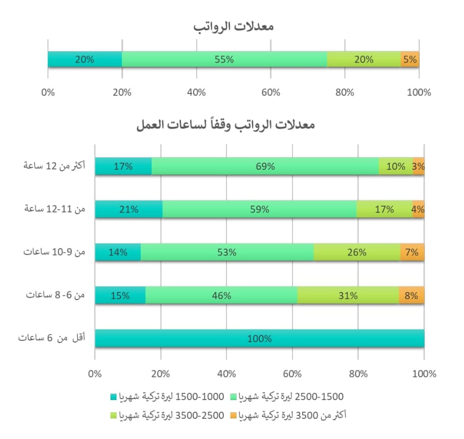 ومع ظروف العمل الطويلة والشاقة تبلغ معدلات الرواتب وسطياً بين 1500-2500 ليرة تركية (175 -300 دولار[13]) وفقاً لما أشارت به نصف الشريحة المستطلعة آراؤها، فيما يتقاضى 20% من هذه الشريحة راوتب تتراوح بين 2500-3500 ليرة تركية (300-410 دولار)، ويتقاضى 5% رواتب تزيد عن 3500 ليرة تركية شهرياً (الشكل 3).