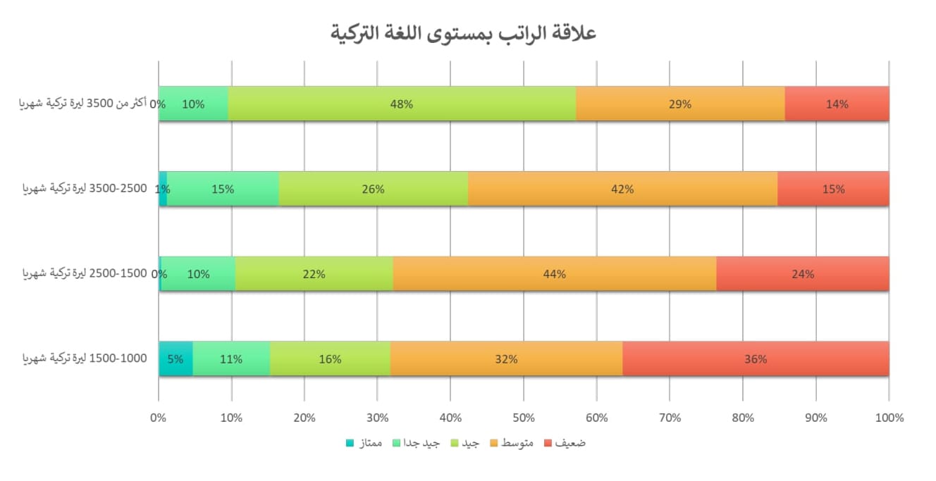 وحول علاقة اللغة التركية بالقدرة على الحصول على فرصة عمل براتب مقبول تُظهر نتائج الاستبانة أن القدرة على التحدث باللغة التركية يمكن أن يزيد فرصة الحصول على راتب أعلى؛ إذ تصل نسبة الذين يتحدثون اللغة التركية بشكل جيد ويتقاضون رواتب أقل من الحد الأدنى للأجور إلى 32% من هذه الشريحة، بينما تراوحت نسبة الذين يتحدثون اللغة التركية بشكل جيد ويتقاضون رواتب أعلى من الحد الأدنى للأجور بين 42% لشريحة الرواتب (2500-3500 ليرة تركية) و 58% لشريحة الرواتب أعلى من 3500 ليرة تركية؛ إلا أن إتقان اللغة التركية لا يُعد شرطاً أساسياً لتحسن الرواتب[20](الشكل5).
