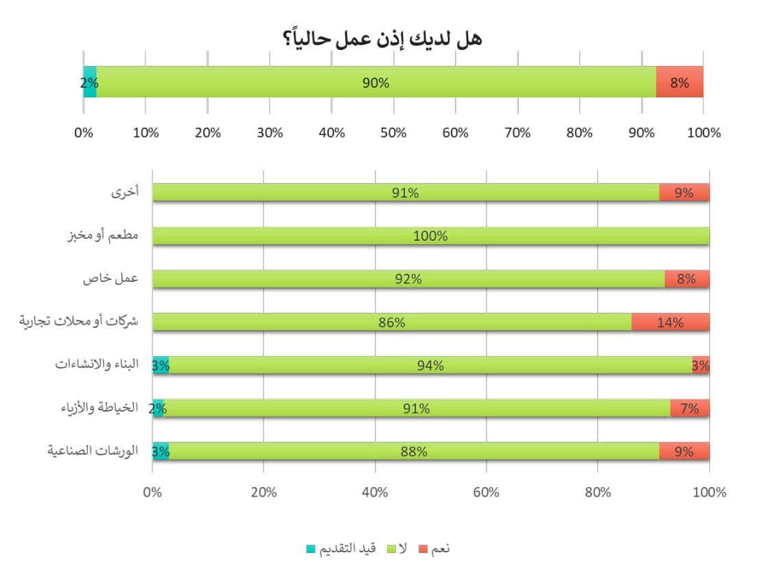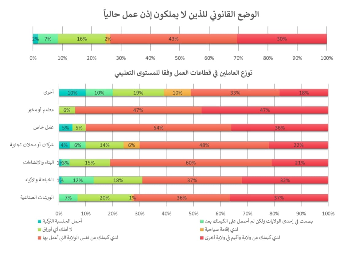 وحول الوضع القانوني للعاملين السوريين في السوق التركية يعمل 90% من الشريحة المدروسة بشكل غير نظامي، ودون تراخيص عمل رسمية، رغم أن 85% منهم ليس لديهم أي عائق قانوني لاستصدار هذه التراخيص؛ إنما يرجع السبب الرئيسي لتهاون أرباب العمل والرغبة في التهرب من دفع التأمينات الاجتماعية في محاولة لتخفيض تكلفة الإنتاج.