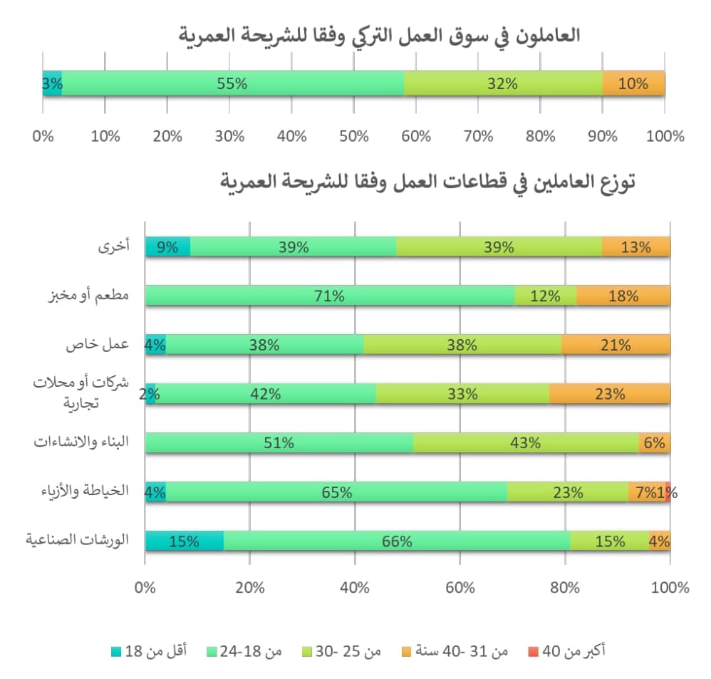 وحول طبيعة العمالة السورية في سوق العمل التركي نجد أن العمالة السورية ضمن الشريحة المدروسة التي دخلت سوق العمل التركي تُعد عمالة شابة؛ إذ ينتمي 87% من هذه العمالة للشريحة العمرية بين 18-30 عاماً، إلا أن هذه العمالة تمتلك مستويات تعليم منخفضة، خاصة في الشرائح العمرية الصغيرة؛ إلا أنها تضم أيضاً عمالاً مؤهلين “أكثر من المطلوب” من حملة الشهادات الجامعية بنسبة 20 % من إجمالي العاملين السوريين، حيث يعملون في مِهن منخفضة الكفاءة وفي غير اختصاصاتهم، وهو ما يتسبب بخسارة مضاعفة؛ تعود عليهم كأفراد نتيجة عدم استغلال إمكاناتهم الكاملة وتوظيفها في مجالها، وخسارة أيضاً للاقتصاد التركي، حيث يُعاقبون مرتين في سوق العمل؛ أولاً لعدم الحصول على تصريح عمل، ثم لعدم الاعتراف بشهاداتهم.
