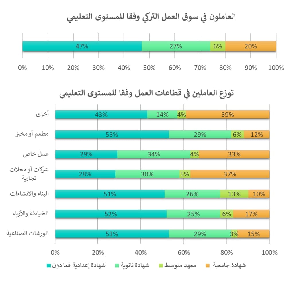 وتتقارب النسب الواردة في الاستبانة مع نتائج مسح أجراه الهلال الأحمر التركي عام 2018، يشير إلى أن نصف السوريين تقريباً لم يحصلوا سوى على تعليم ابتدائي أو متوسط، في حين أن نسبة 20% من السوريين بين 18 و29 سنة في إسطنبول يحملون شهادة جامعية، لكنّ هذه الشهادات لا تُترجم بأجور أعلى في سوق العمل[31].