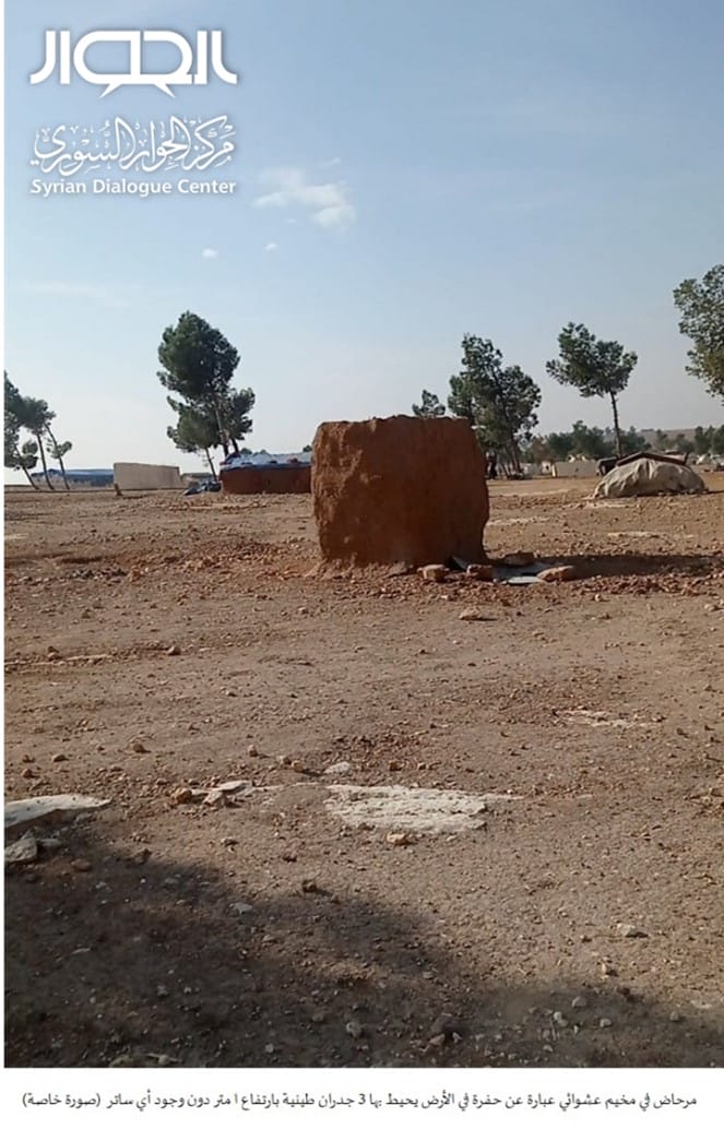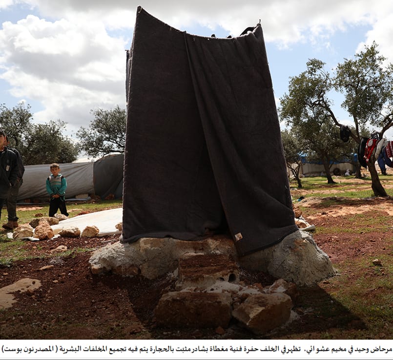 - مرحاض عشوائي يُلاحظ في المخيمات العشوائية، تم إنشاؤه من قبل السكان، وهو عبارة عن حفرة في الأرض محاطة بشوادر قماشية، أو بجدران من اللبن – الطين الجاف- على شكل غرفة دون سقف، حيث تصبّ المخلفات في حفرة صحية أكبر ملاصقة للمرحاض.