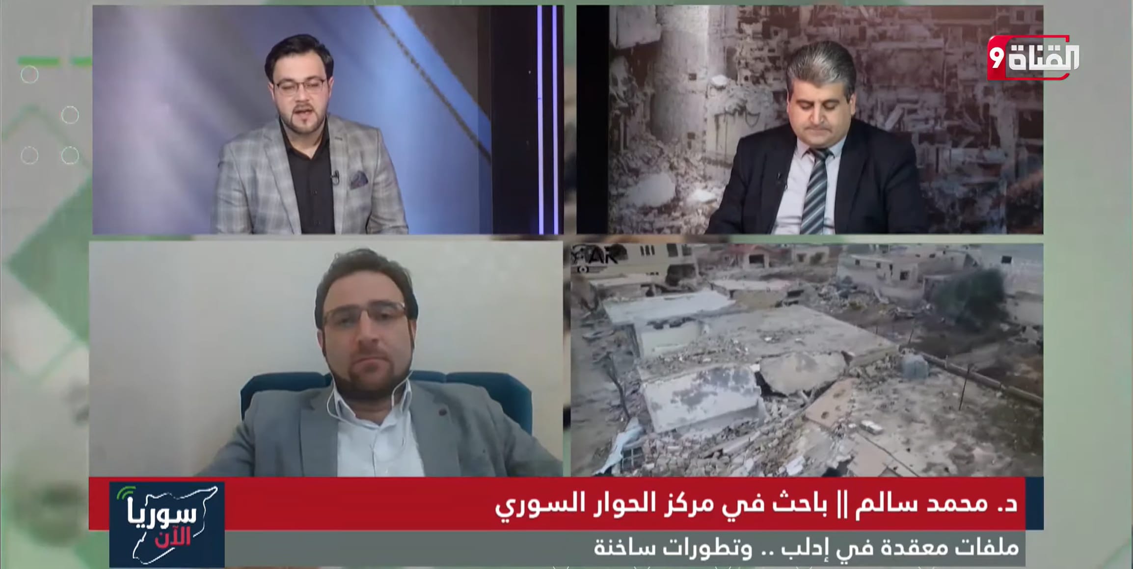 خلال مشاركته بمداخلة على “القناة التاسعة” حول تصعيد النظام السوري في إدلب رغم اتفاق روسيا وتركيا، قال الباحث في مركز الحوار السوري د. محمد سالم، إن الخروقات ستستمر من قبل النظام السوري والمليشيات الإيرانية لكن الهدنة بشكل عام تبقى راسخة.