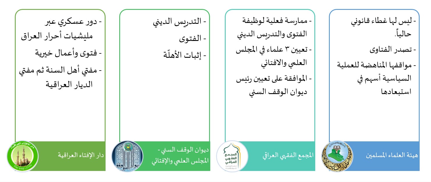 في الحالة العراقية تبيّن أن التنظيم الرسمي للإفتاء في العراق جعل “ديوان الوقف السّنّيّ” الذي يضم في هيكليته “المجلس العلمي الإفتائي” الجهة المسؤولة عن هذا الدور، بغضّ النظر عن دقة النص القانوني وتفصيله، مع منح غطاء قانوني في الوقت ذاته للمجمع الفقهي العراقي كمرجعية علمية سنّيّة غير رسمية، ويضاف إلى ذلك وجود غطاء قانوني ما -رغم جدليته- “للصميدعي” الذي يحظى بدعم إيراني.