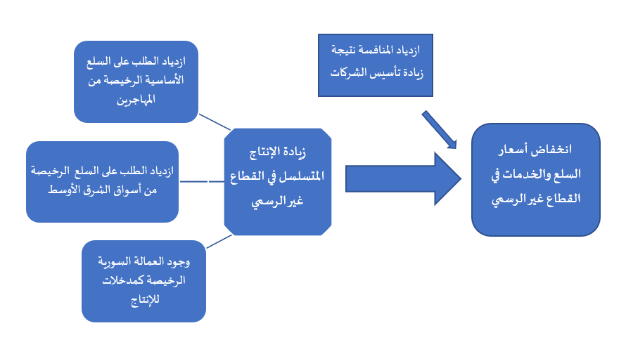 يمكن تفسيره بأن الطلب على السلع الأساسية من المهاجرين قد ولّد إنتاجاً متسلسلاً مكثفاً أكثر من الطلب؛ مما أدى إلى زيادة في العرض مقارنة بالطلب، لاسيما مع وجود مدخلات الإنتاج الرخيصة وكثرة المنافسة، نتيجة كثرة العارضين الناتجة عن زيادة عدد الشركات وانخفاض تركيز السوق، ويُضاف إلى الطلب المحلي ازدياد الطلب من الأسواق التصديرية التي أسهم المهاجرون السوريون في زيادة الصادرات إليها، خاصة أسواق سوريا والعراق وليبيا وبقية أسواق الشرق الأوسط؛ وهي أسواق تركز على التنافسية السعرية بالدرجة الأولى، بمعنى أن أحد أهم العوامل الجاذبة هو انخفاض أسعار السلع النسبي[17].