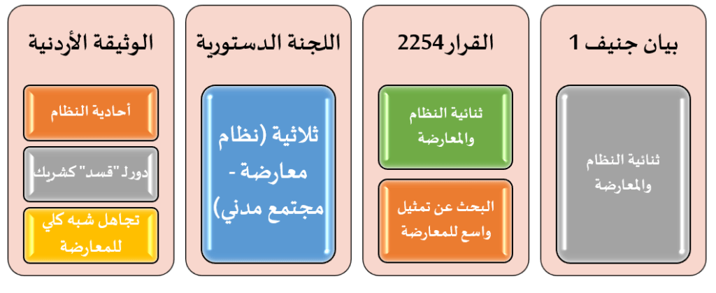 شكل توضيحي يبين كيفية حضور نظام الأسد وقوى الثورة والمعارضة في الأوراق الأربع