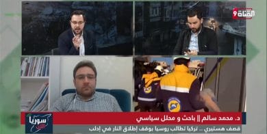 خلال مشاركته في مداخلة على "القناة التاسعة" حول التصعيد الروسي في إدلب، قال الباحث في مركز الحوار السوري د. محمد سالم، إن روسيا تحاول الضغط على تركيا في إدلب من أجل الحصول على تنازلات في ليبيا.