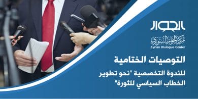 تعريف بباكورة الندوات التخصصية لمركز الحوار في مسار دفع الجهود باتجاه تطوير الخطاب السياسي، بعنوان "نحو تطوير الخطاب السياسي للثورة"، وتوصيات الندوة.
