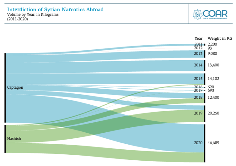 The size of the Syrian drug economy, especially the value of the Captagon pill trade in the country, is estimated at nearly 16 billion US dollars annually. This is three times the Syrian government budget for the year 2022. An analysis made by the Center for Operational Analytics and Research – (COAR) concluded that authorities, mainly in Europe and the Middle East and North Africa region, seized at least 173 million Captagon pills (34.6 tons) and 12.1 tons of Hashish that were exported from Syria in 2020. The market value of this confiscated quantity of Captagon pills is estimated at approximately $3.46 billion US dollars[16].