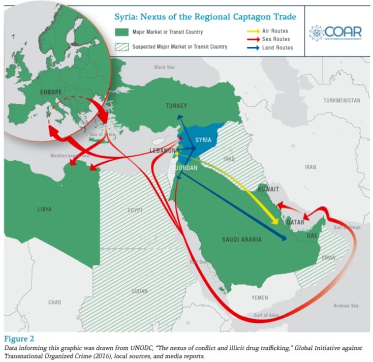 Narcotics leave Syria, especially Captagon shipments, moving towards three main destinations: North Africa, The Arabian Peninsula, and Europe. The available evidence indicates that Europe is now a transit point for narcotic substances destined for the Middle East and North African markets[6].